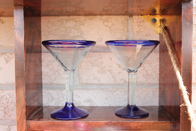 There's space on one side for bottles (alcoholic or otherwise) and shelves on the other side for glasses. We're a little partial to coconut rum and banana liquor. That bottle came home with us from our last trip to Cuba.