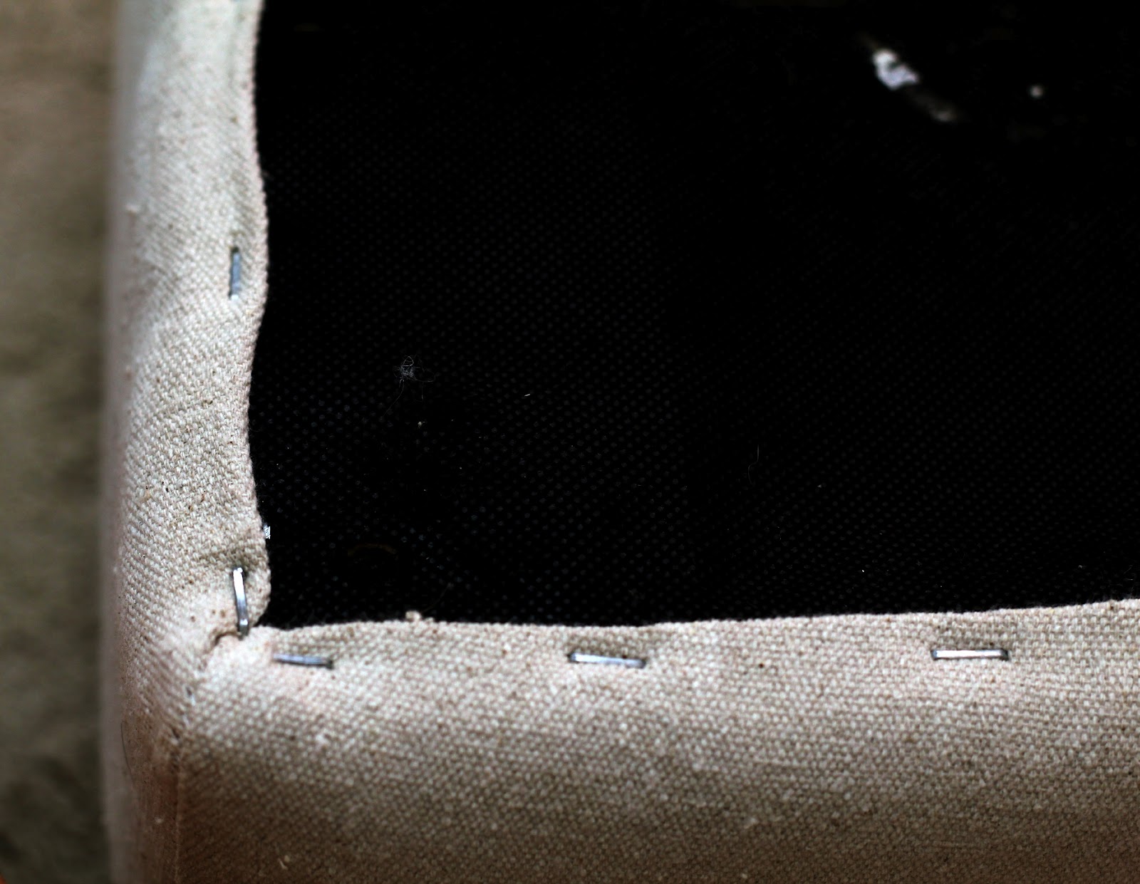 Most people recommend starting in the center of each side when you're stapling, but I was able to get it to lie flatter when I started at the corners. Once all four corners were stapled down, I stapled along the sides, folding the material under to get a nice finished edge. I then screwed the legs back on.