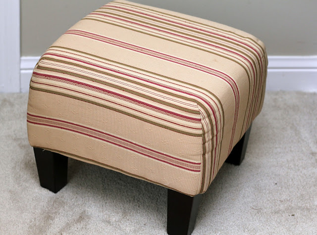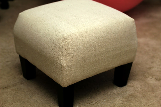 One of my favourite things was recovering a small footstool we have. This stool was a gift from my aunt and I use it all the time. It sits under my desk and I prop my feet up so that my legs are at a more comfortable angle. It's a cute stool, very padded, but the fabric colours don't suit my taste any more. So off with its head! No really, everything stayed in place and I just covered over it.