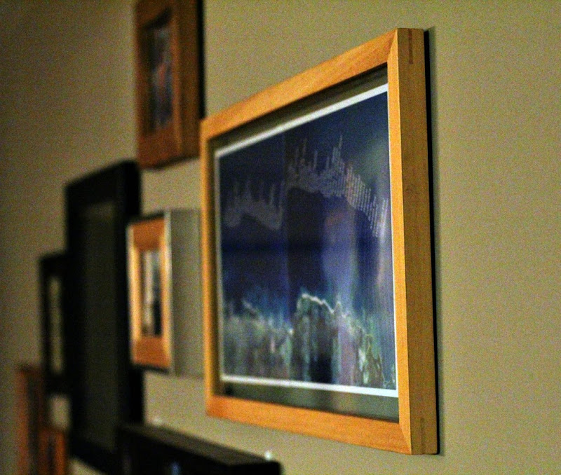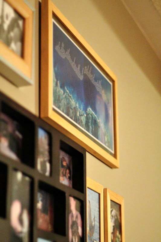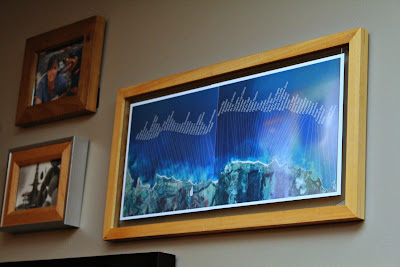 Anyway, I took several photos of the picture because I never thought I'd see it again. (It turns out it's a poster that you can buy and they'll even ship it for free.) One of the frames on our sad gallery wall is 9.5 x 16.5. Kind of crazy dimensions, but perfect for this picture. I had to print it out in two parts as the largest photo paper I had is 8.5 x 11, but I don't think the seam detracts from it that much. And I can't for the life of me figure out why the blue tones changed right in the middle.