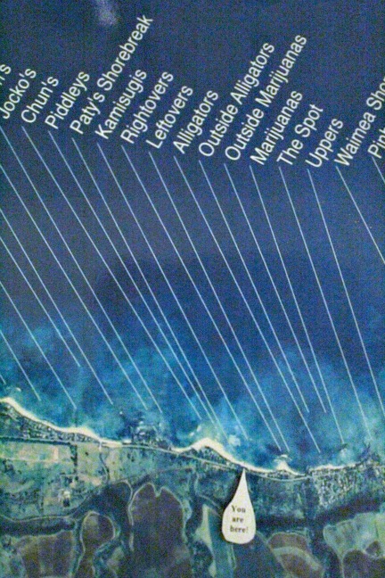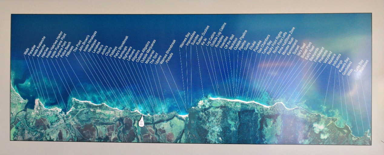 The last time we vacationed in Hawaii we rented a 2 bedroom cottage on the North Shore, right on the beach. Hanging in the living room of the cottage was a satellite photo of the North Shore showing every surf spot between Turtle Bay and Waialua. Believe it or not, there are