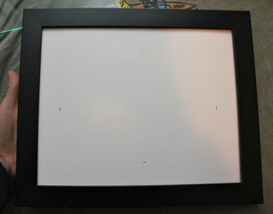 I then added about an inch on each side and marked that on the mat. I also put it into the frame to make sure it would look balanced once it was all together. I don't know if you can see the tiny marks but they're there, one on each side.