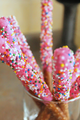 You only need three ingredients for this - pretzel rods, candy melts, and nonpareils (or any other topping that suits you). I bought the melts and nonpareils at the bulk store for just a couple of dollars, and the pretzels were about 3 dollars for an entire bag.