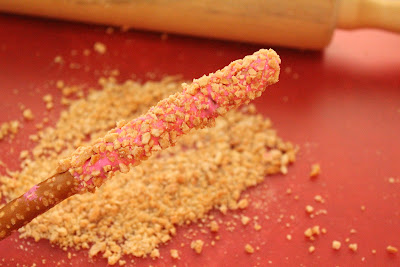 I ran out of nonpareils with two rods left so I improvised with crushed honey-roasted peanuts. Not as pretty but they still taste good. I also tried rice krispies (they looked like mini clubs) and chocolate chips (too heavy, wouldn't stick).