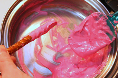 Dip a rod into the melted chocolate - about halfway up - and spin it around to get an even coating. You then should wait a minute or two to let it cool a bit before adding the nonpareils. You can roll it directly into the nonpareils if you want a heavy coating, but I just held the rod over the bowl and sprinkled them by hand until I got the coverage I was looking for.