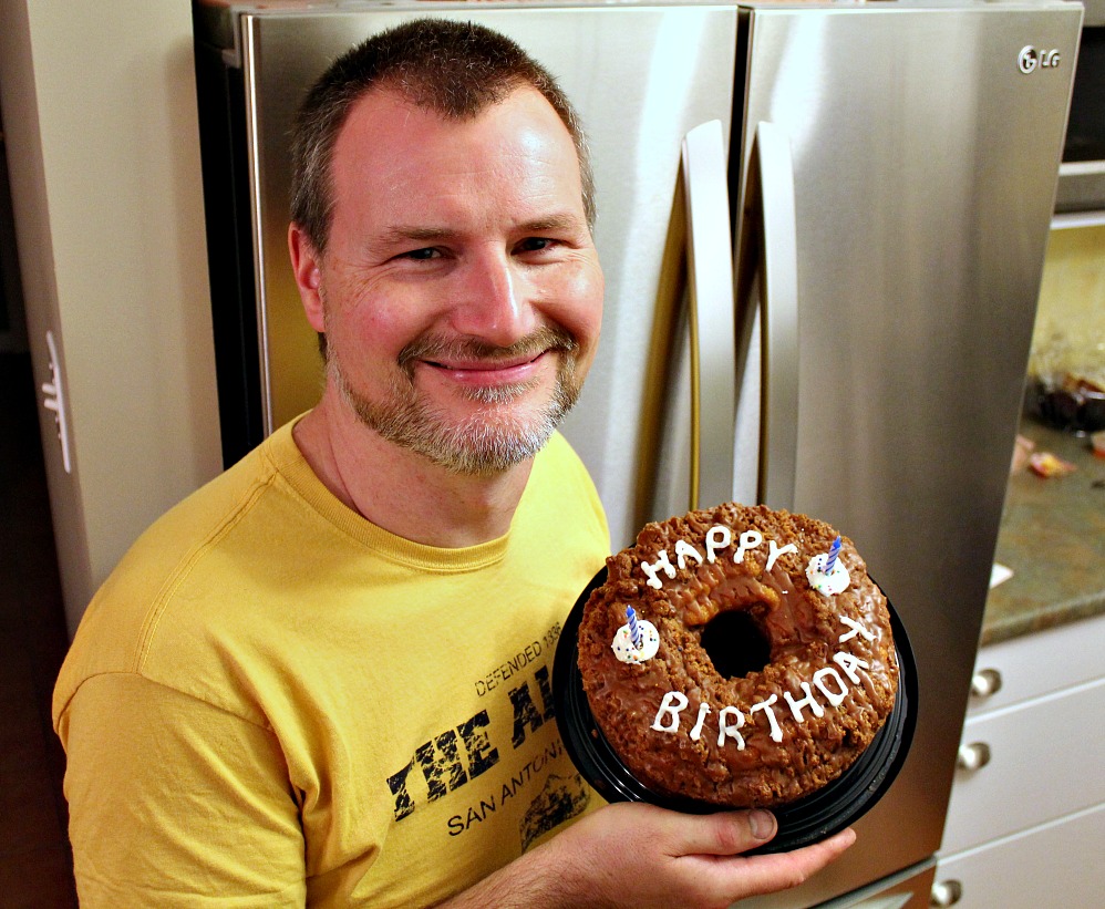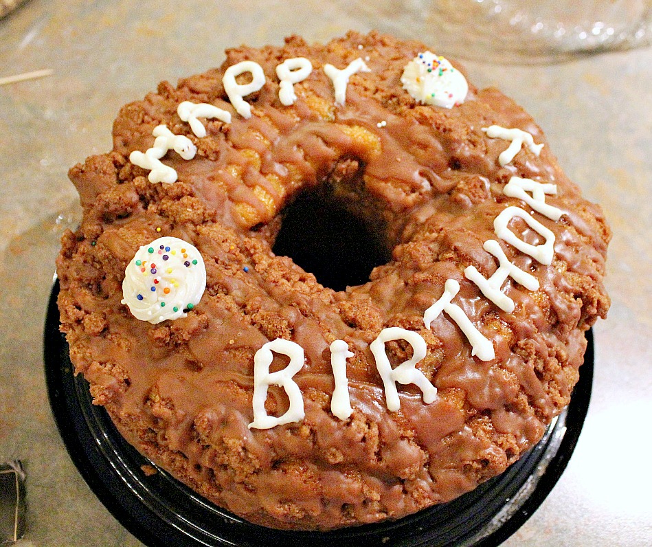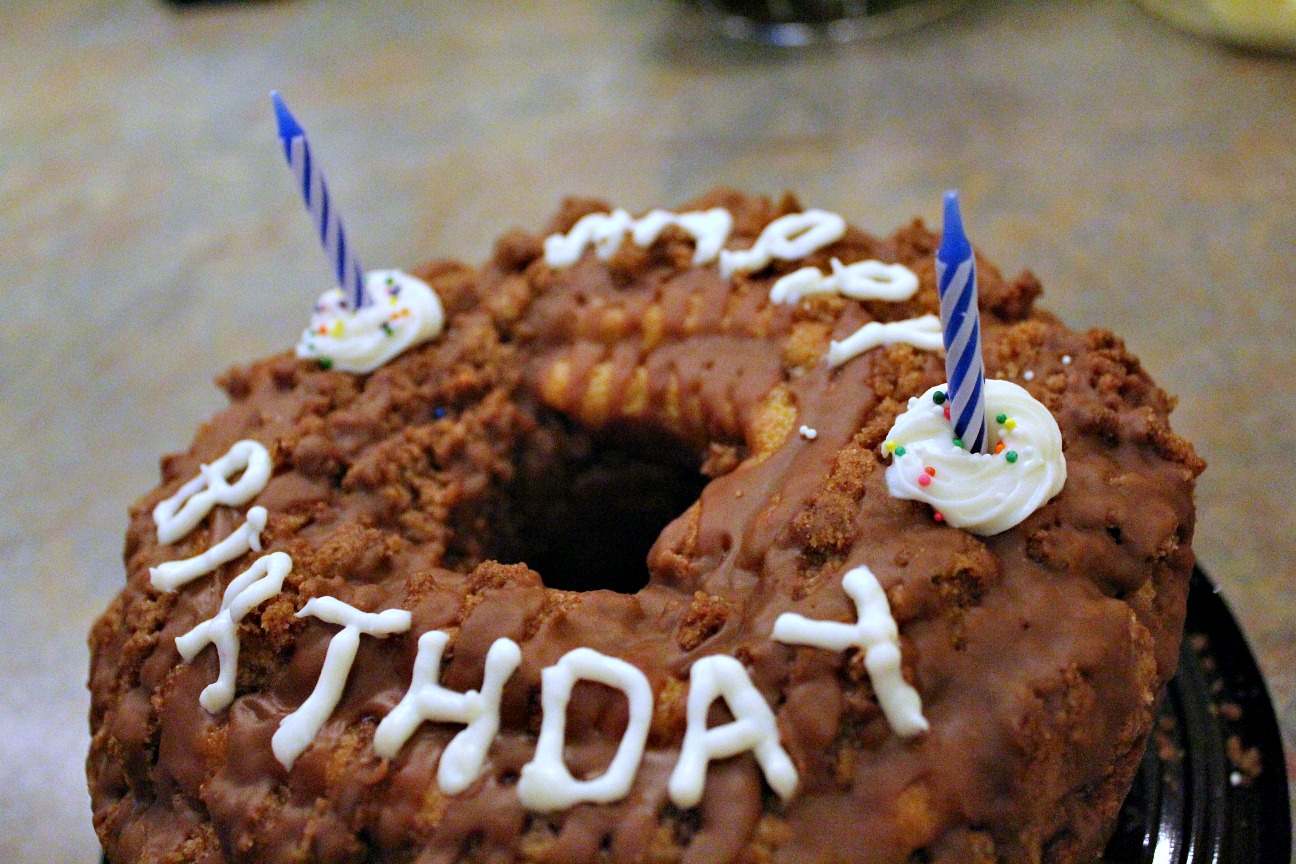 Last year I asked the bakery dept. at the grocery store if they could write "Happy Birthday" on the coffee cake for me. No, they could not. So this year I was prepared. I bought cake decorating tools at the dollar store and a can of cream cheese frosting.