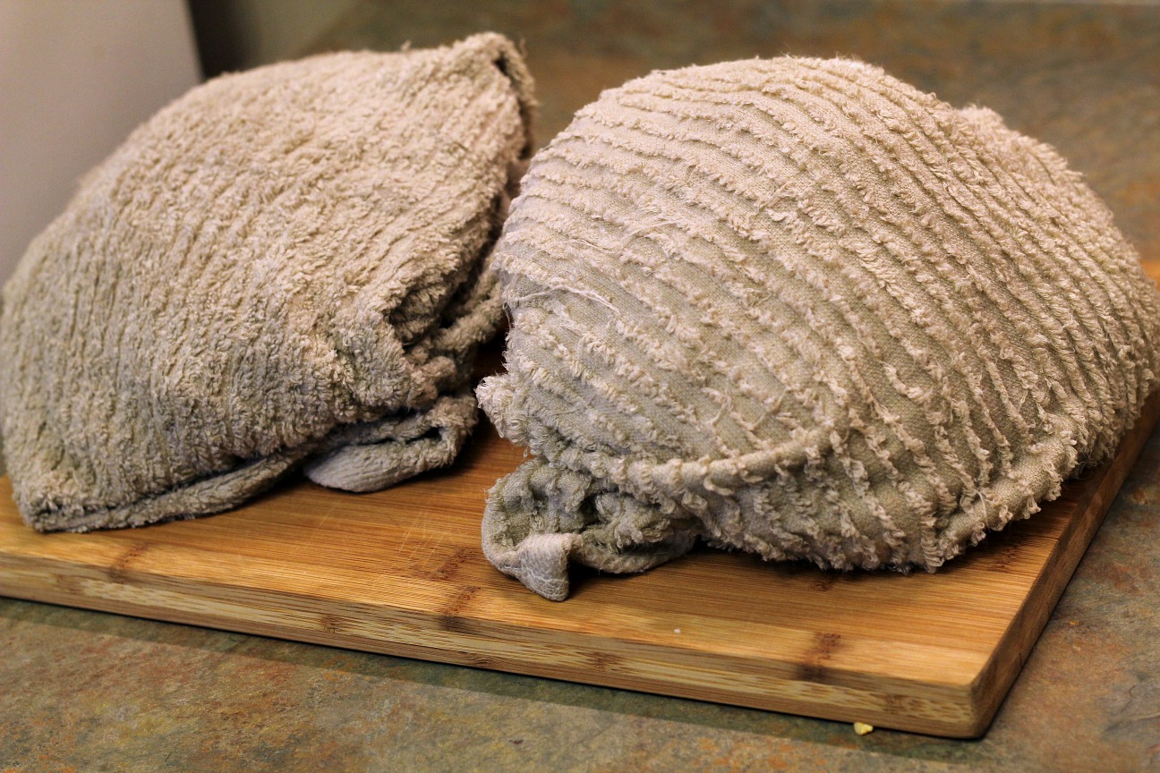 Once removed from the oven you have two choices. If you want a crusty loaf, let them cool as they are. If you like your bread softer, wrap each loaf in a damp (not wet) tea towel and leave to cool. I personally like a harder crust but Tom doesn't, so I wrapped them.